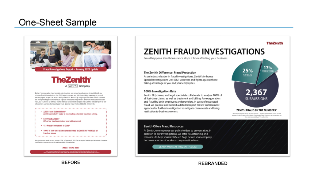 Samples of executive-approved work products range from rebranding through content optimization and redesign to video creation from scratch (ideation, script, editing) to the design of promotional materials.